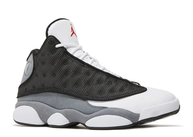 The Air Jordan 13 Retro ‘Black Flint’ dresses the legacy model in OG-inspired color blocking reminiscent of the ‘Flint’ colorway from 1998. Black mesh overlays dominate the upper, featuring a white leather toe box with synthetic grey suede along the midfoot and collar. A crimson Jumpman decorates the white leather tongue, while the 13’s holographic ‘cat eye’ graces the lateral ankle. Anchoring the sneaker is a panther paw outsole, fitted with white herringbone traction pods and an exposed carbon fiber shank plate.